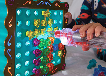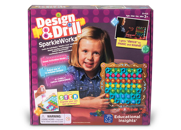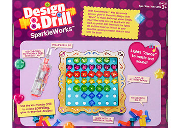 Kit de diseño con pernos de colores y un taladro eléctrico con luz LED, para niños. Pequeños diseñadores potencian su imaginación, desarrollan el pensamiento creativo, mientras colocan coloridos tornillos en un tablero de actividades. Pueden reproducirse cualquiera de los 12 modelos incluidos o crear diseños personalizados que brillaran en la oscuridad.