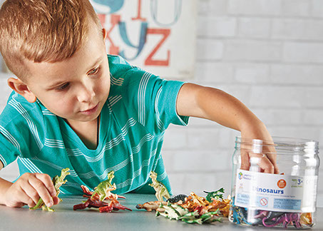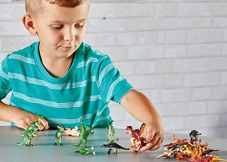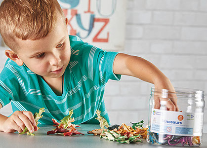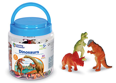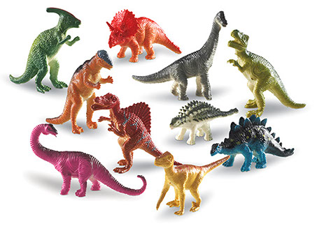 A través del juego los niños conocen e identifican 10 dinosaurios diferentes, desarrollan su imaginación y mejoran su lenguaje y vocabulario. Contar, comparar, clasificar es más entretenido con este kit. Son diez dinosaurios: tiranosaurio rex, estegosaurios, triceratops, brachiosaurus, parasaurolophus, pachycephalosaurus, espinosaurioss, struthiosaurus, apatosaurios, velociraptor)