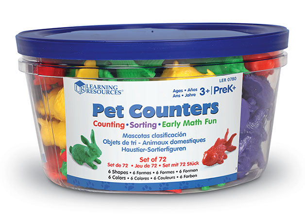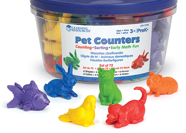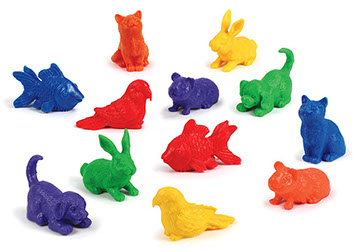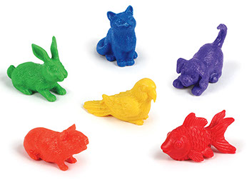 Kit de 72 animales domésticos, perro, gato, pez, conejo, pájaro y cuy en 6 colores brillantes. Contar, comparar y clasificar es más entretenido con estas encantadoras mascotas. De plástico blando, lavables. Miden aproximadamente 3 cm.
