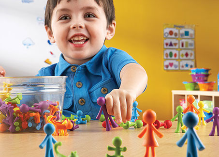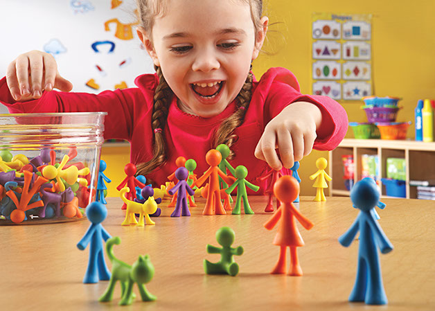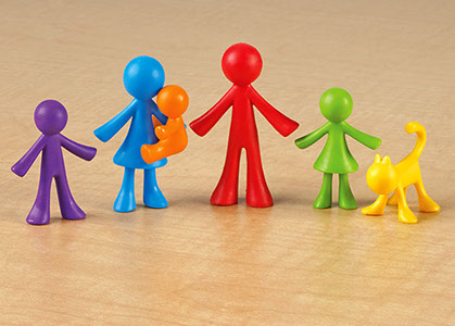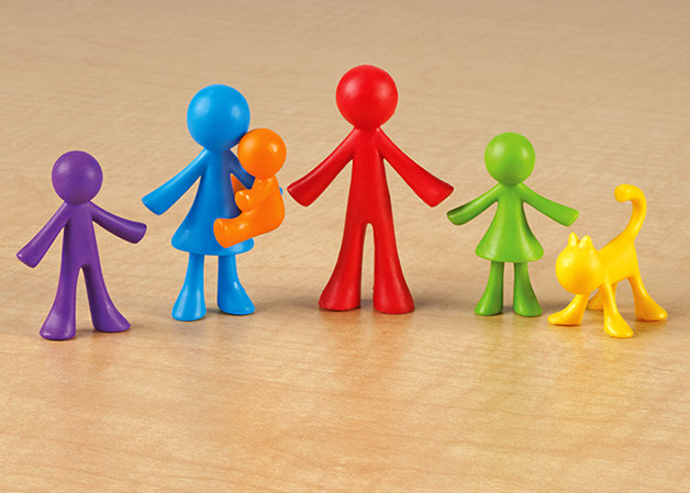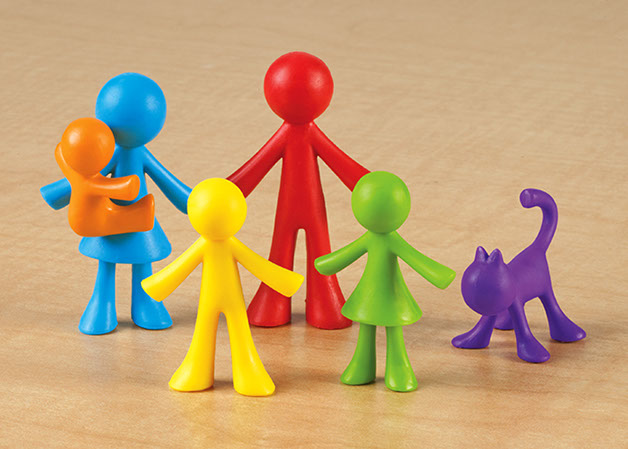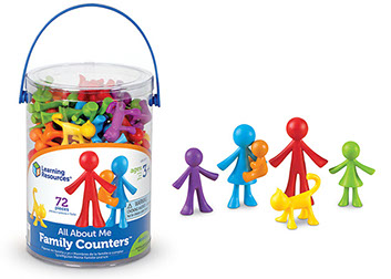 Divertido y colorido kit de muñecos de plástico que representan a los miembros de la familia, incluyendo las mascotas. Permite a los niños expresarse y exteriorizar emociones y sentimientos.