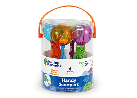 Este set incluye 4 cucharones dobles de colores, diseñados para fortalecer las manos y los dedos, así como para desarrollar los músculos necesarios para escribir y usar tijeras.