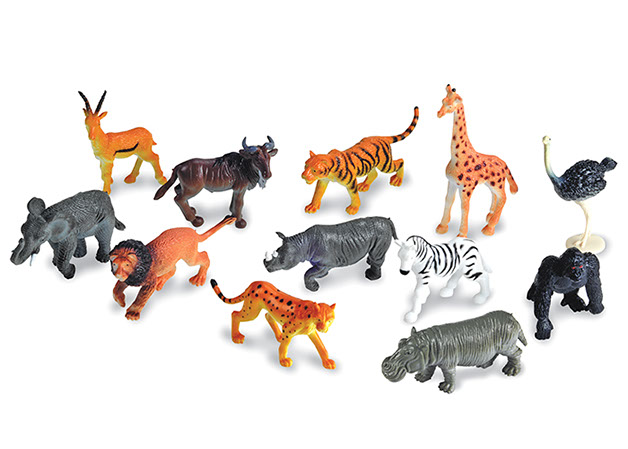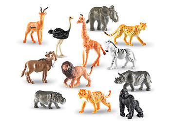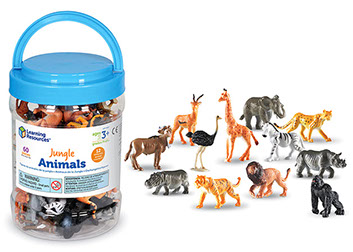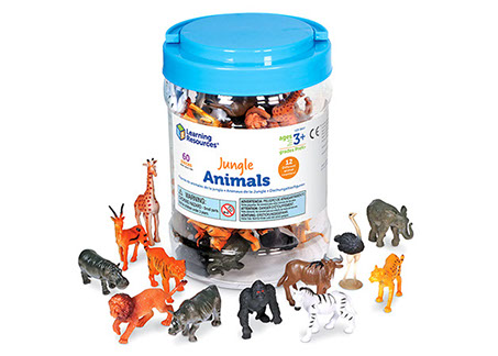 Kit de 60 animales de la selva. Una forma imaginativa de aprender a contar, ordenar y clasificar. Incluye 5 de cada 12 especies diferentes: ñú, gacela, guepardo, rinoceronte, avestruz, elefante, jirafa, león, gorila, cebra, hipopótamo y tigre.