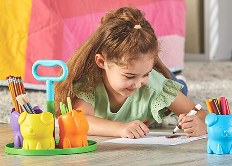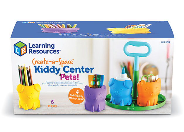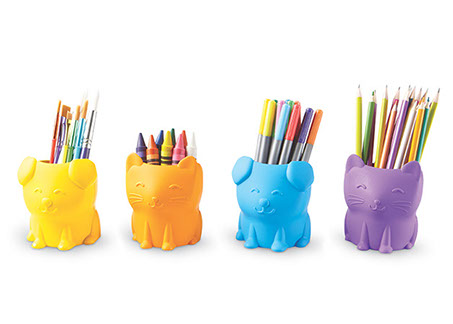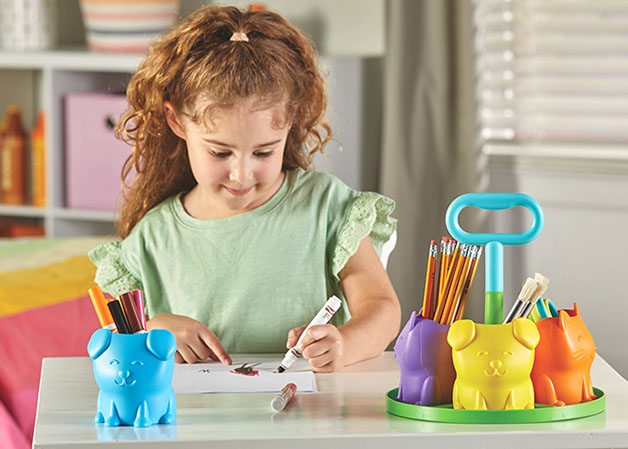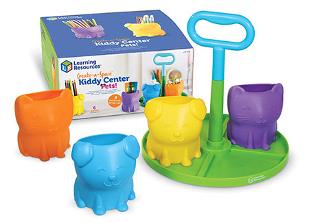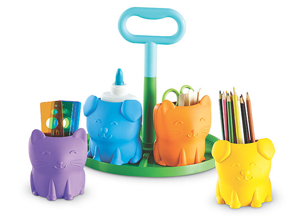 Los niños organizan sus materiales de trabajo, lápices, tijeras, materiales de arte y más en su primer organizador de escritorio. Incluye un asa central de fácil agarre y cuatro coloridos vasos de almacenamiento con simpáticas caras de cachorro y gatito!
