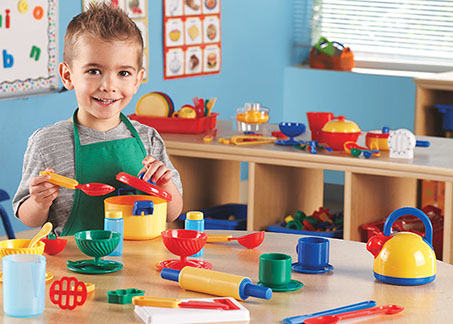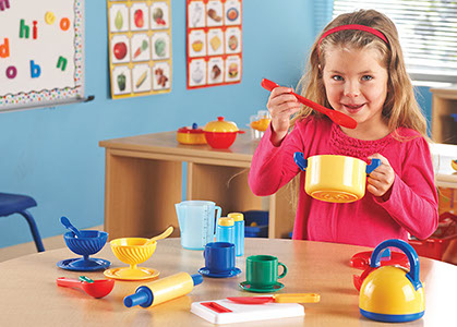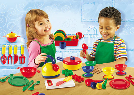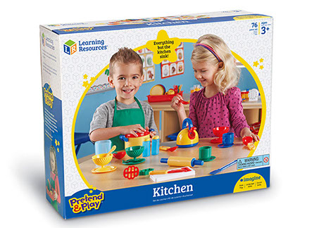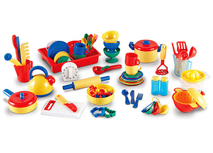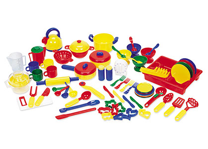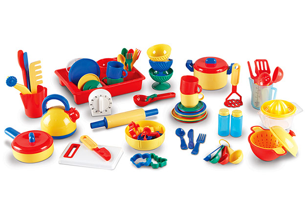 Este juego de cocina de 73 piezas incluye ollas, sartenes, tazas, tazones, platos, utensilios, tetera, colador, jarra, cortadores de galletas, rodillo, exprimidor, y más. Es parte de la línea Pretend & Play que fomenta el desarrollo saludable de la primera infancia al ayudar a los niños a interpretar e imitar el mundo que los rodea.