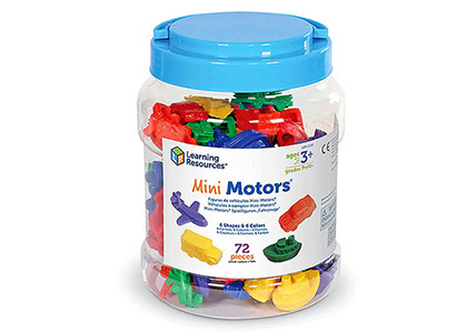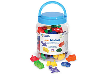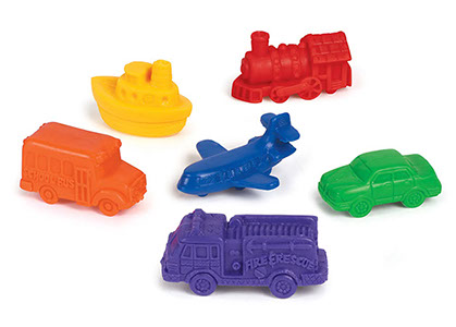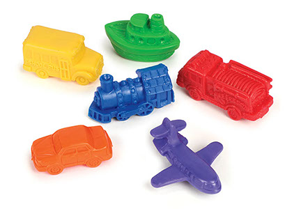 Set de 72 medios de transporte de plástico suave, en seis colores y formas.
