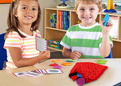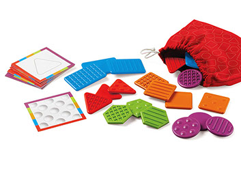 Kit de 20 piezas, 5 formas y 4 texturas. Ideal para desarrollar el sentido del tacto y la motricidad fina. Utilizando sólo el tacto los niños identificarán las fichas que coincidan en forma o textura. Incluye 10 tarjetas de actividades.