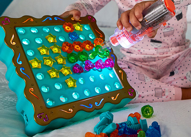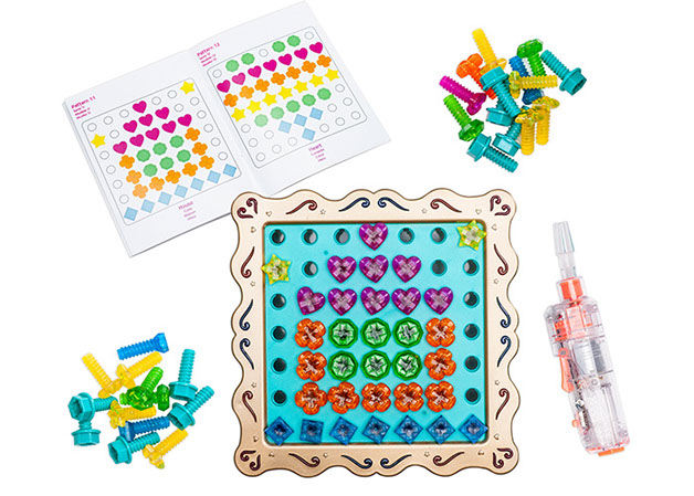 Kit de diseño con pernos de colores y un taladro eléctrico con luz LED, para niños. Pequeños diseñadores potencian su imaginación, desarrollan el pensamiento creativo, mientras colocan coloridos tornillos en un tablero de actividades. Pueden reproducirse cualquiera de los 12 modelos incluidos o crear diseños personalizados que brillaran en la oscuridad.